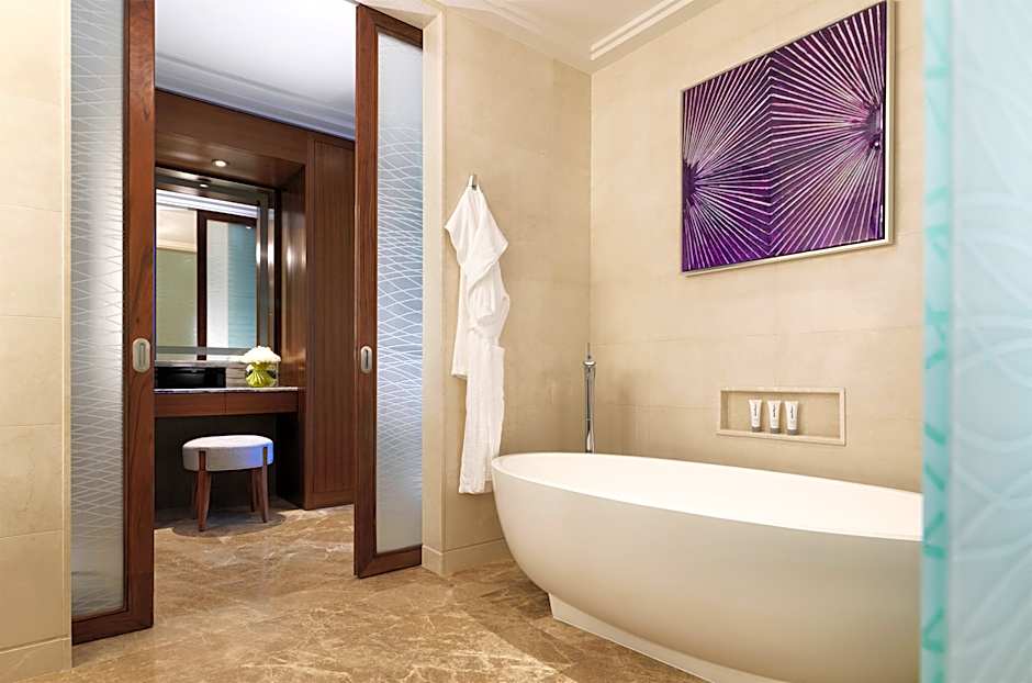 Deluxe Rooms are spacious and sophisticated for the modern traveler. Unwind from a day of shopping, site seeing or business meetings in the living area, complete with a sofa for two and a large, adjustable table for dining. Feel at ease by the room’s soothing blue- and gray-colored furnishings, and by the spacious white and gray marble bathroom that features a separate deep soaking tub and shower. Deluxe Rooms offer all of the high-tech amenities, luxurious touches and ample living space you need to feel right at home during your stay in Abu Dhabi. Deluxe Rooms can accommodate maximum of one extra bed or one baby cot.